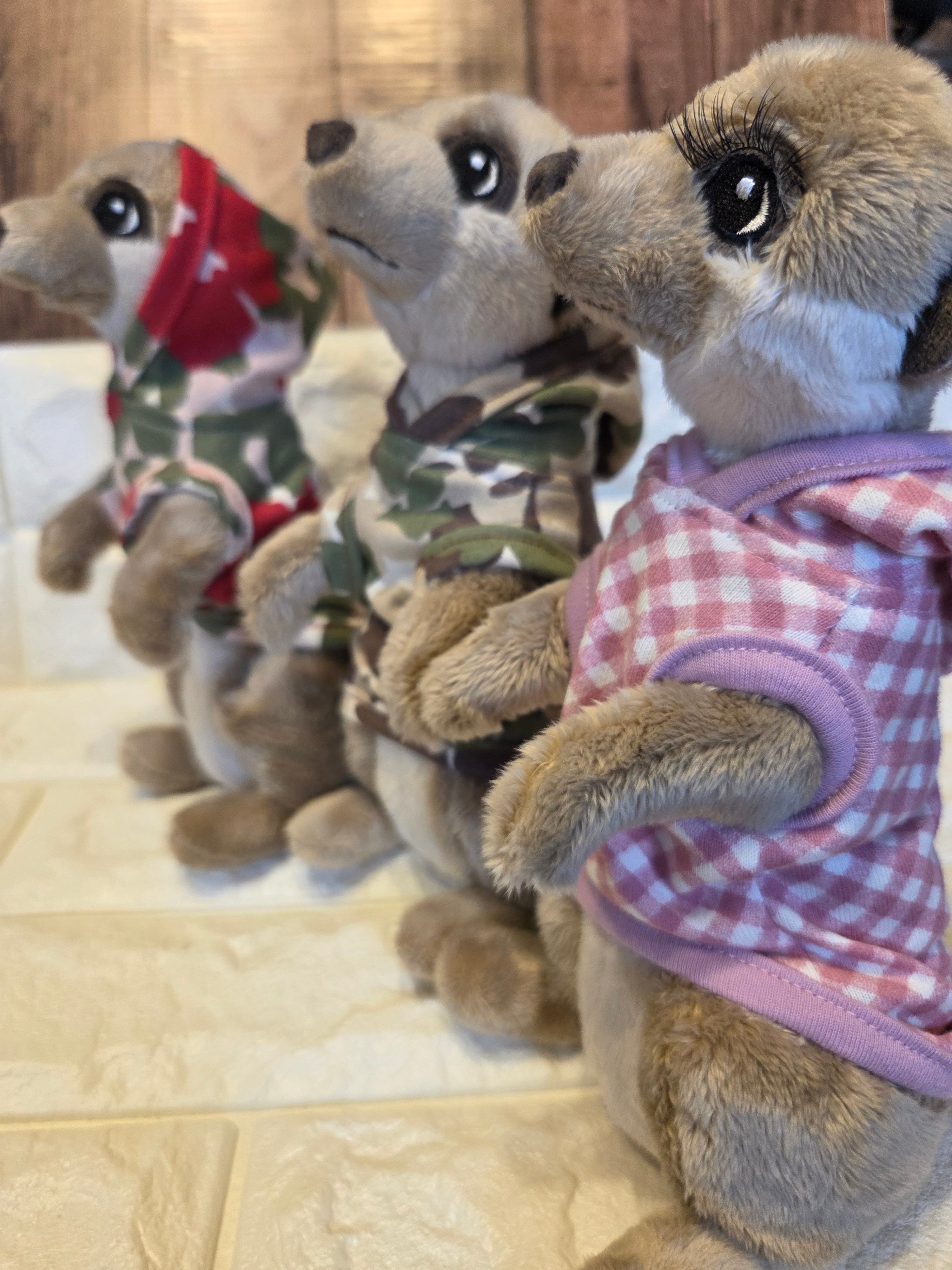 ミーアキャットちゃん本人を計測する場合は、首(肩の上辺り)、胴(脇の下の胴周り)、着丈(首〜足の付け根(曲がる所まで))を計って下さいね。